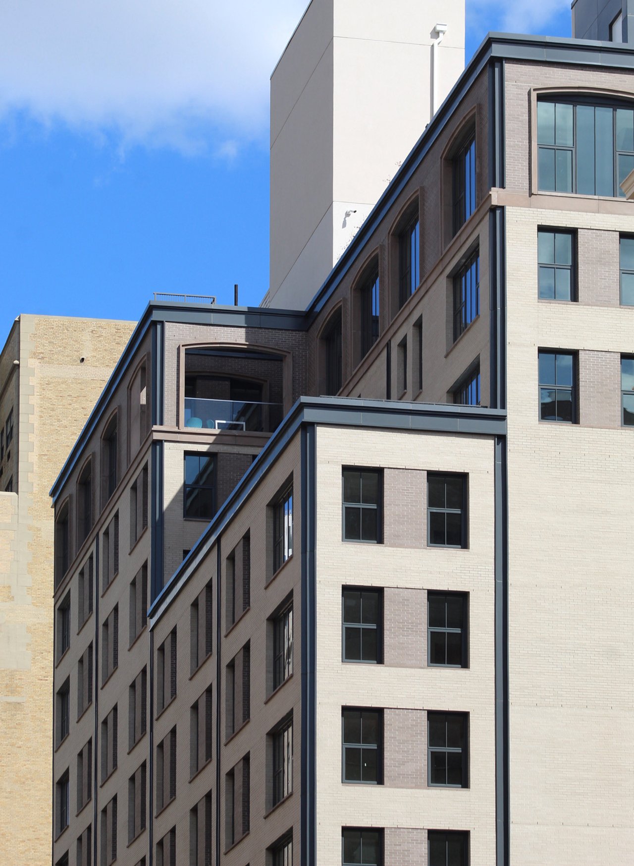 One of the nicest architectural aspects of the envelope are the wide arched windows on the lower and upper floors. The dark panels lining the edges, corners, and setbacks add contrast with the brick masonry walls between the spacious grid of windows. A rectangular canopy protrudes over the sidewalk and main doors and is flanked by floor-to-ceiling glass for the 3,000 square feet of retail frontage.
